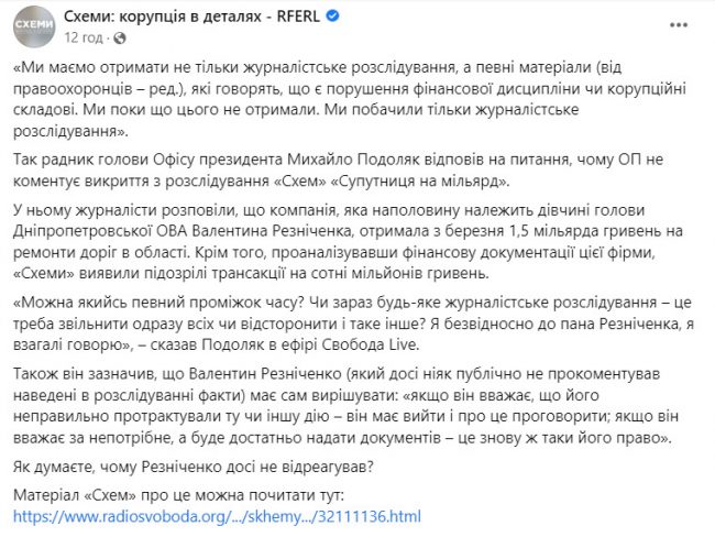 «Мы должны получить не только журналистское расследование, а определенные материалы (от правоохранителей. — Ред.), которые говорят, что есть нарушения финансовой дисциплины или коррупционные составляющие. Мы пока этого не получили. Мы увидели только журналистское расследование», — так Подоляк ответил на вопрос, почему ОП не комментирует разоблачение по расследованию «Спутница на миллиард».