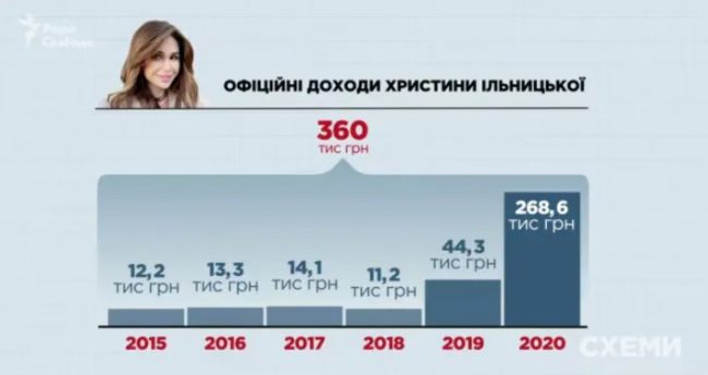 Ее официально задекларированные перед государством доходы за 10 лет, по информации источников «Схем» с доступом к таким данным, составляют всего 360 тысяч гривен. Причем за последние три года Ильницкая официально вообще ничего не заработала.