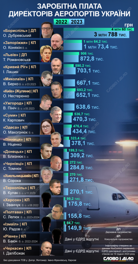 На втором месте по уровню зарплаты оказался исполняющий обязанности директора аэропорта в Запорожье Александр Коняхин: в 2022 году получил 1 млн 64,2 тысяч гривен зарплаты, а в 2023-м — 1 млн 73,4 тысяч грн.